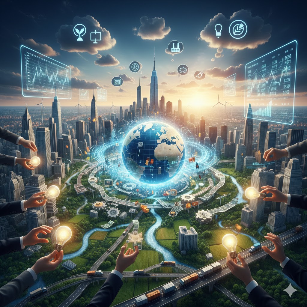This essay examines the 21st-century economy by focusing on the balance between digital transformation, globalization, and sustainable growth. It explains how the digital economy is reshaping work and business by creating opportunities while threatening traditional jobs. Furthermore, it discusses the shift from globalization to deglobalization due to political tensions and fragile supply chains. Finally, it highlights the importance of green growth in addressing climate change and argues that long-term economic success depends on balancing technology, global cooperation, and environmental responsibility.