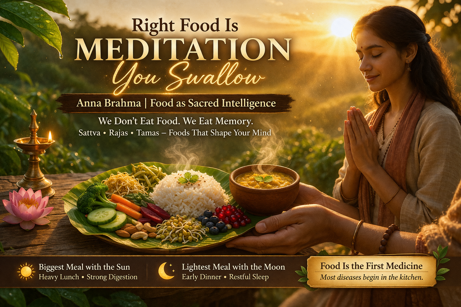 Discover how food shapes your mind, emotions, and overall well being. Rooted in ancient wisdom like Anna Brahma, this article reveals how eating is a form of meditation. Learn about sattva, rajas, tamas, conscious eating, and how the right food can heal, energize, and transform your life naturally, deeply, and sustainably.