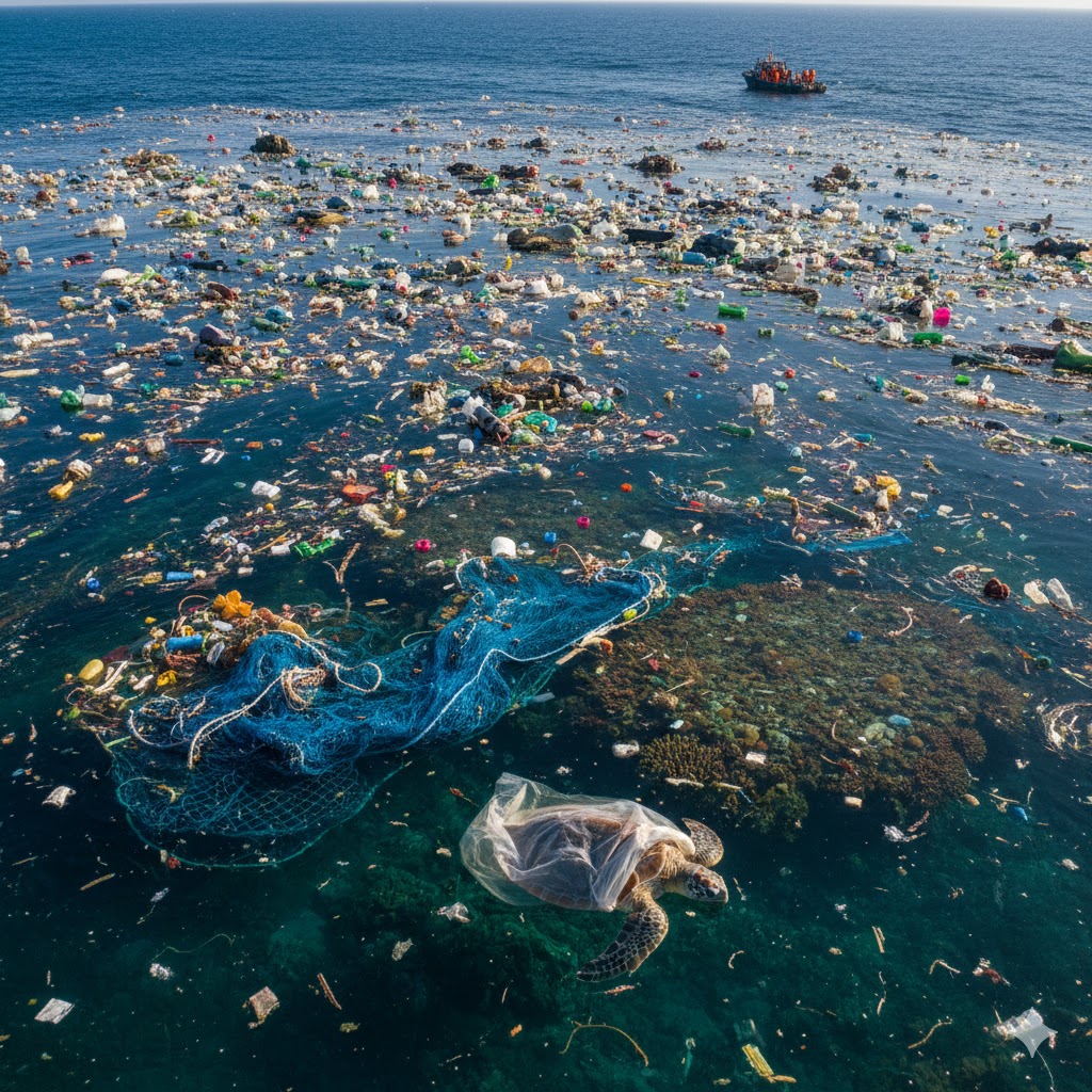 The Great Pacific Garbage Patch is the physical manifestation of the "Psychology of Disposability." Every piece of polythene or single-use plastic that escapes a waste management system has the potential to be carried by river systems and ocean currents into these gyres.