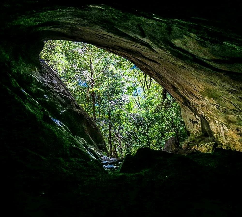 Walk a short forest trail to the cave entry.