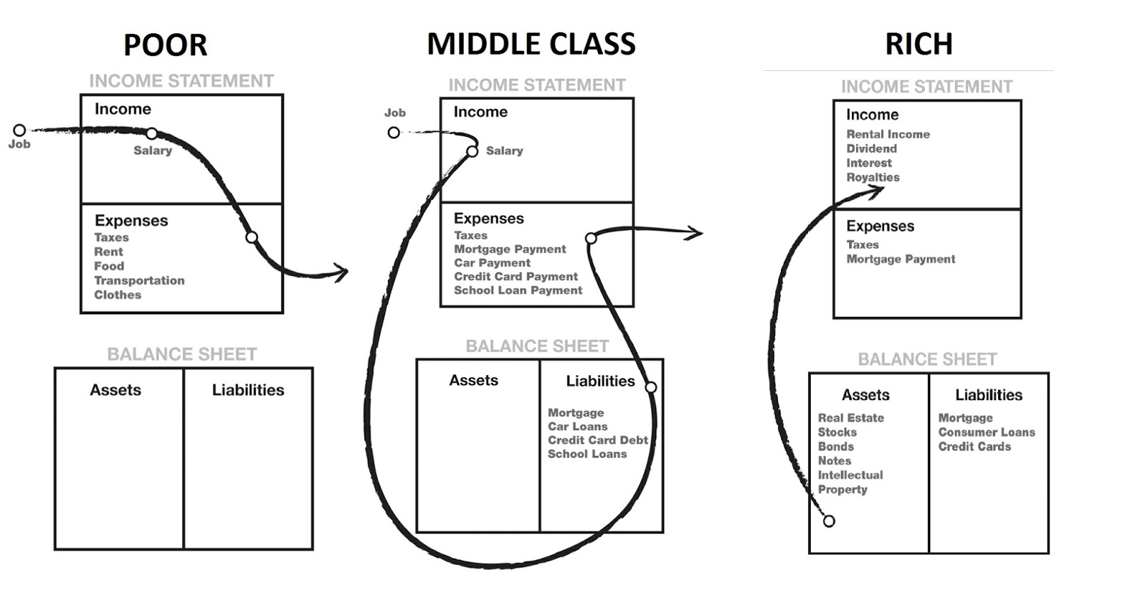 According to Kiyosaki, “the rat race is a simple process: work to make money, spend to live, then work to pay debts. The more you earn, the more you spend. If you have no assets, you will keep on working.”