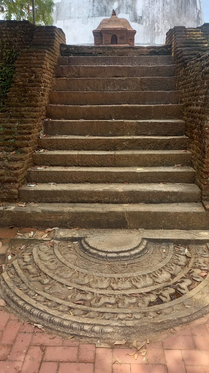 The Chandra Vatta Kal, or moonstone, is easy to overlook if one walks too fast—but it is one of Polonnaruwa’s most meaningful artistic expressions. Carved with concentric bands of animals, vines, and geometric patterns, it symbolises the cycle of life, desire, discipline, and spiritual liberation. As I paused to observe its worn yet graceful curves, I realised how deeply philosophy was woven into everyday architecture. These moonstones were not decorative luxuries; they were silent teachers placed at thresholds, reminding all who entered sacred spaces to leave worldly attachments behind.