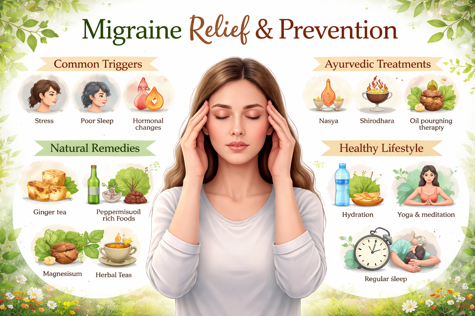 Migraine is a neurological condition that causes intense headaches, often triggered by stress, hormonal changes, poor sleep, diet, or environmental factors. Symptoms include throbbing pain, nausea, and sensitivity to light and sound. Managing migraine involves identifying triggers, maintaining a healthy lifestyle, and staying hydrated. Natural remedies like ginger, herbal teas, and proper rest can help relieve symptoms. Ayurveda offers treatments such as Nasya, Shirodhara, and herbal support to balance the body. With proper care, routine, and mindfulness, migraines can be reduced and controlled effectively.